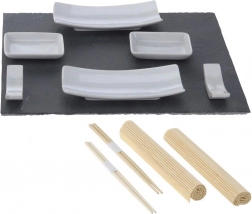 Takket være den gennemtænkte sammensætning tilbereder du nemt et måltid for to: komfortable spisepinde med hvilere, skåle til saucer, kompakte rulleunderlag og en stenplade til servering af sushi og sashimi. Sættet er ideelt til hverdagsbrug, fejringer og aftener i japansk stil.