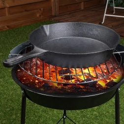 Takket være kompatibilitet med alle typer kogeplader – gas, elektrisk, glaskeramisk, halogen og induktion – og muligheden for brug i ovn eller direkte over ild er panden et fremragende valg både i køkkenet og udendørs. To integrerede hældetude gør det nemt at hælde saucer og fedt uden spild.