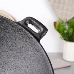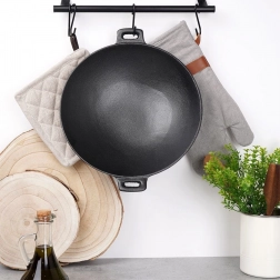 Alsidig støbejerns-wok med en diameter på 30 cm og to håndtag, ideel til hurtig sautering, stegning ved høj varme samt bagning i ovn. Den massive støbejernskonstruktion akkumulerer og fordeler varmen jævnt, så du opnår perfekt sprødhed og saftighed. Velegnet til gas, el, glaskeramik, halogen og induktion.