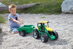 Traktoren er fremstillet af højkvalitets plast, som tåler daglig brug og vejrpåvirkninger. Traileren gør det muligt at transportere små genstande, hvilket udvikler børns fantasi og motorik. Takket være den høje bæreevne er legetøjet stabilt og sikkert.