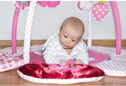 Forskellige materialer, knitrende dele og kontrastdetaljer understøtter udviklingen af syn, hørelse og berøring.