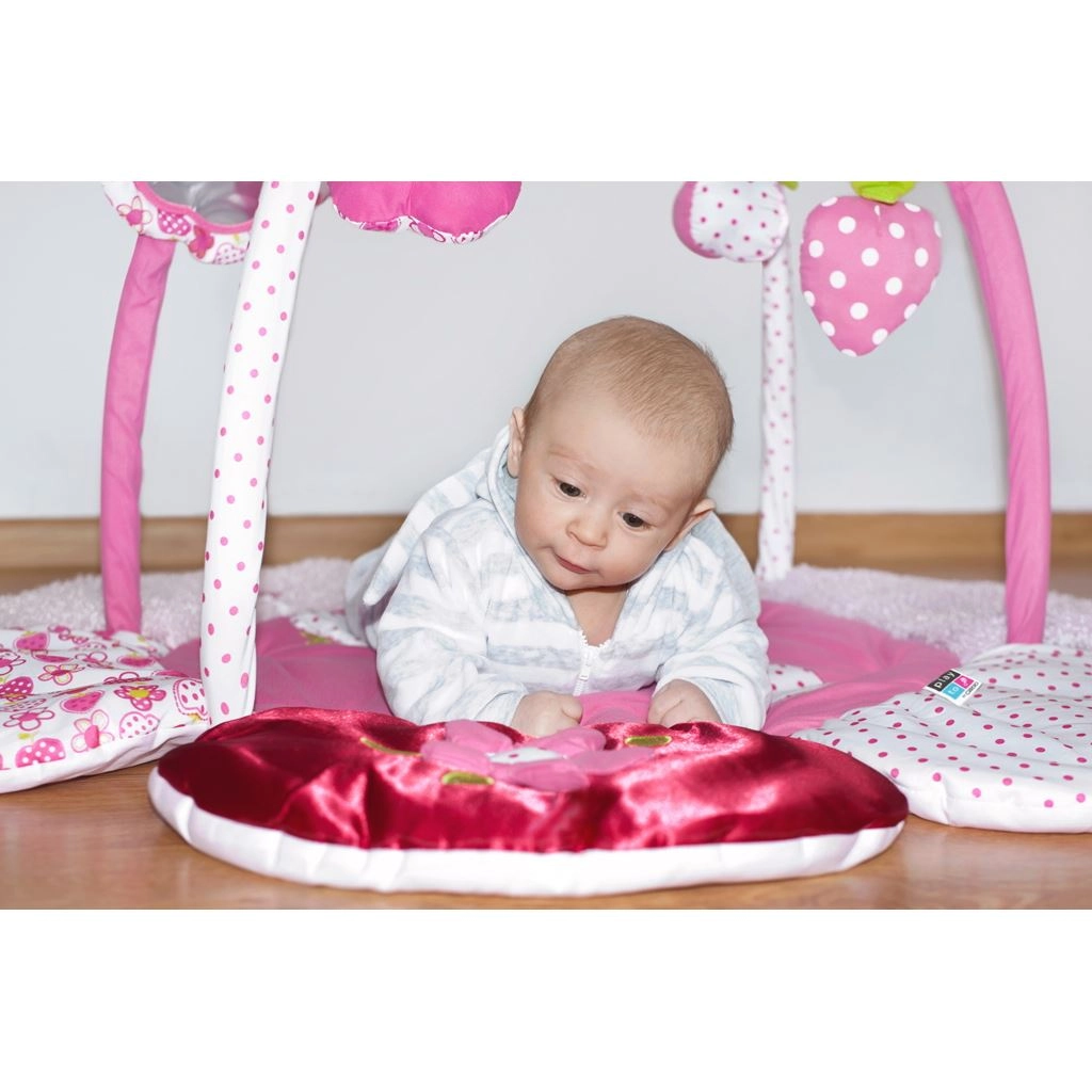 Dette stilfulde legetæppe i blomsterform skaber et hyggeligt og sikkert hjørne til leg og hvile. Blød polstring sikrer komfort på både mave og ryg, mens den aftagelige bøjle med sødt legetøj motiverer til at løfte hovedet, strække sig og gøre de første opdagelser.