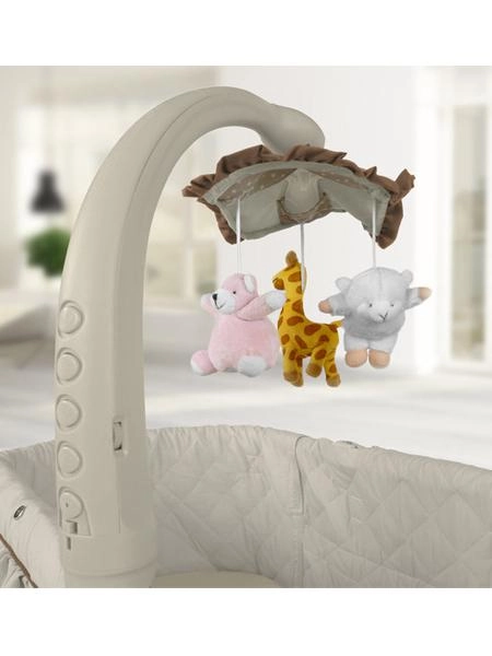 Integreret karrusel med plysdyr tilbyder melodier, natlys og blide vibrationer. Lydstyrke og lysstyrke justeres nemt, eller det hele kan styres med fjernbetjeningen.
