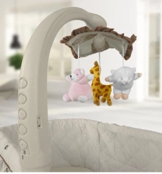 Karrusellen med plysdyr suppleres af et elektronisk modul med melodier, blide vibrationer og natlys – ideelt til at berolige og gøre indsovningen nem. Alt styres med fjernbetjeningen. Takket være hjul med lås kan vuggen let flyttes rundt i hjemmet; når hjulene tages af, forvandles den til en gyngeseng. Den nederste kurv giver praktisk plads til bleer og udstyr lige ved hånden.