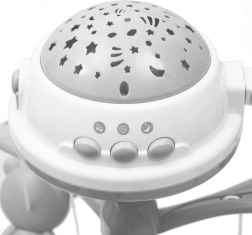 Denne elegante grå tremmesengskarrusel BABY MIX giver babyen både visuel og auditiv stimulering og beroliger den stille før sengetid. Den integrerede lysprojektor med stjerner skifter farver og kan fungere som natlampe, der gør børneværelset ekstra hyggeligt.