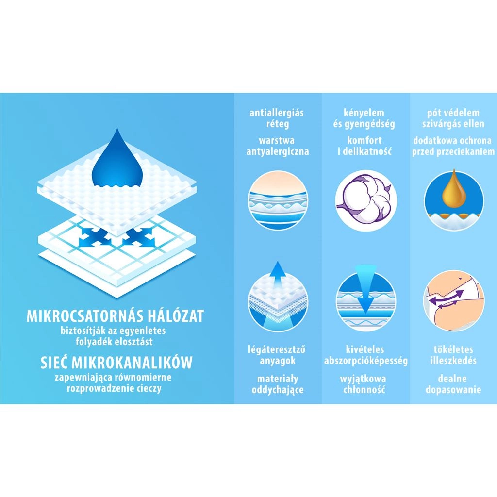 Det ekstra bløde indre 3D-lag og det brede, bløde frontbælte sikrer behagelig brug, selv ved længere tids anvendelse. 3D velcrolukning og elastiske manchetter giver perfekt tilpasning og bevægelsesfrihed, mens særlige bløde volanter mod lækage beskytter selv meget aktive børn.