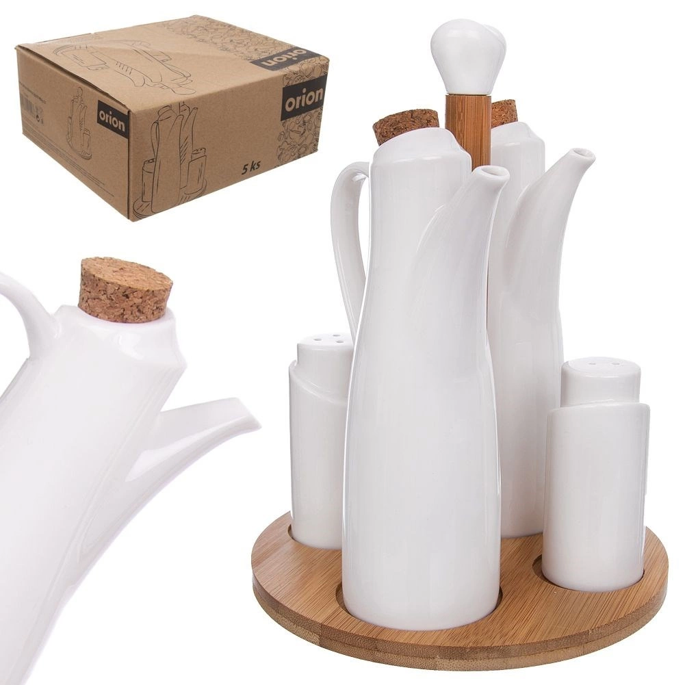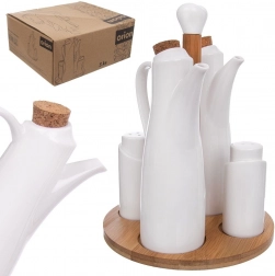 Elegant porcelænssæt til bordet med drejeligt bambusstativ, der holder krydderier og dressinger overskueligt lige ved hånden. Indeholder flasker til olie og eddike, saltbøsse og peberbøsse. Porcelænsbeholderne er robuste og nemme at rengøre, det bambusbaserede stativ giver stabilitet og stil, korkpropper bevarer friskheden af olie og eddike, og de praktiske mål passer på ethvert bord.
