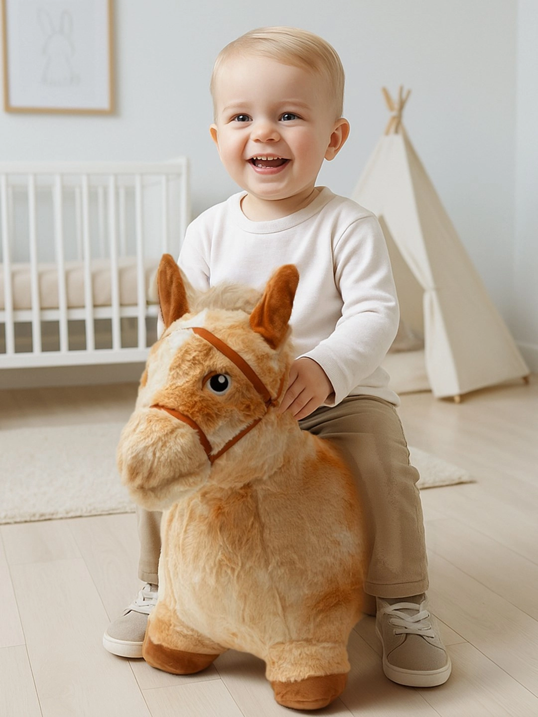 Den plyssete hoppende hest PLAYTO kombinerer sjov, bevægelse og sikkerhed. Den oppustelige krop er dækket af blød, behagelig plys, som sikrer komfortabelt greb og stabilitet under leg. Når man trykker på ørerne, afgiver hesten naturtro lyde, der stimulerer fantasien og forlænger legen.