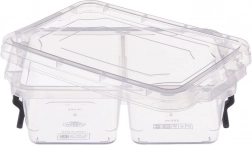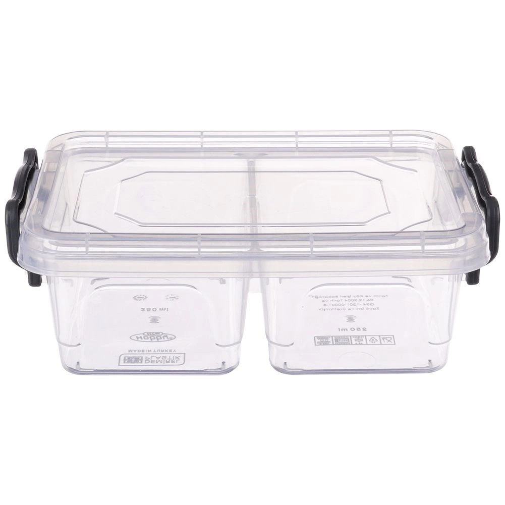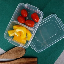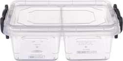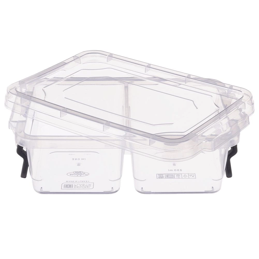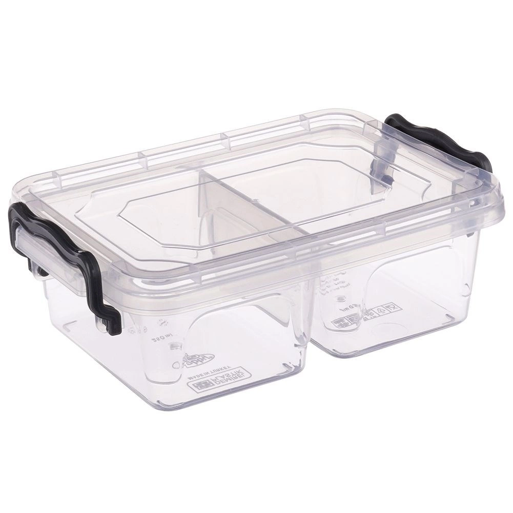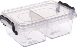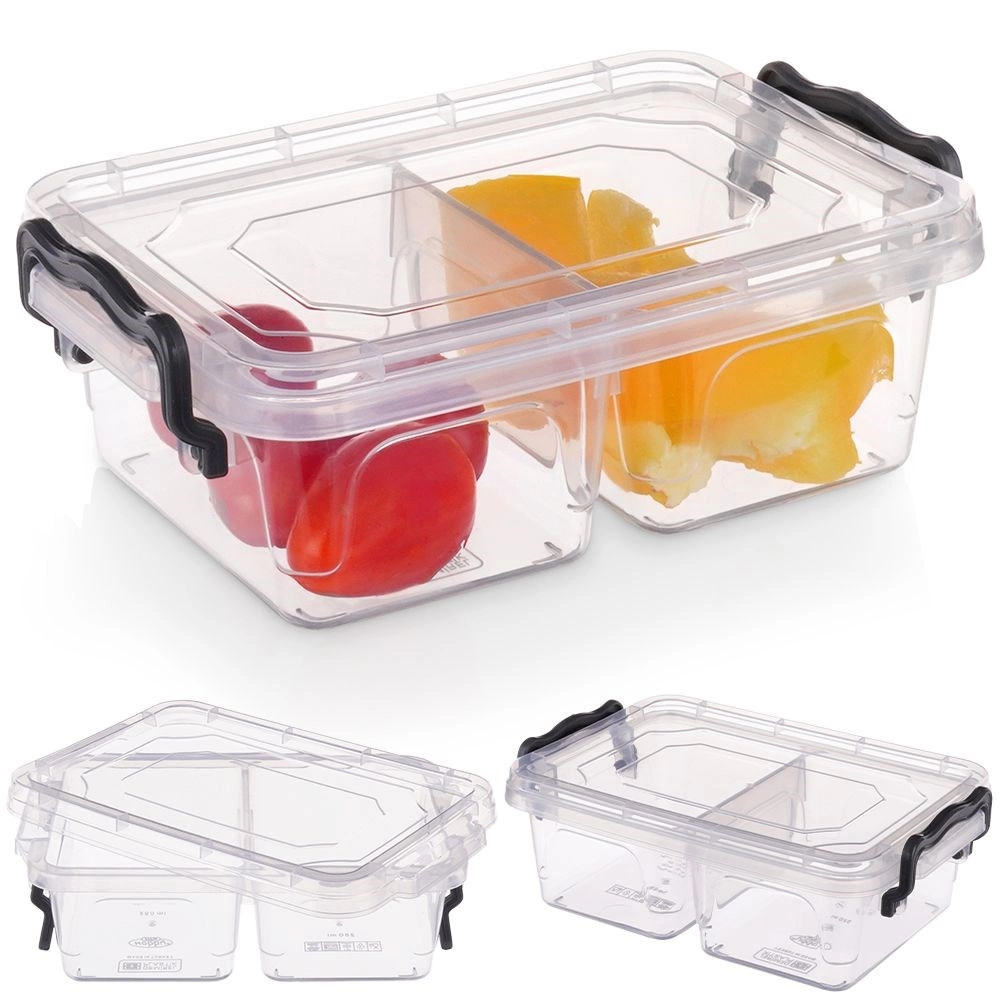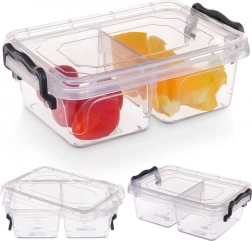 Gennemsigtig madbeholder med et rumfang på 500 ml, som gør det let at holde snack og tilbehør pænt adskilt takket være 2 separate rum. De robuste lukkeklip holder indholdet friskt og minimerer risikoen for lækage. Det klare design giver altid overblik over indholdet.