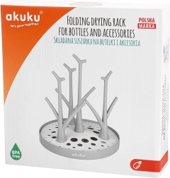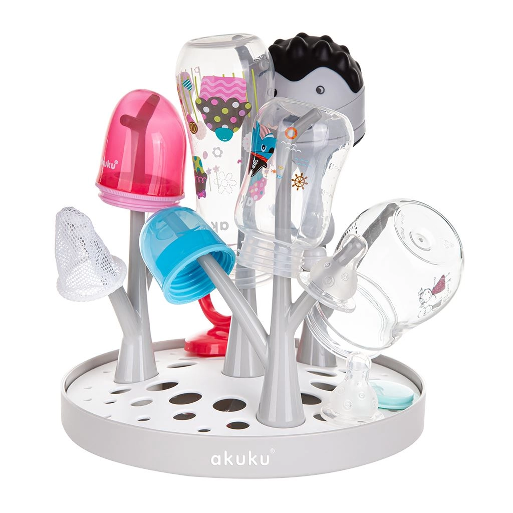 Praktisk og kompakt drypstativer til flasker og tilbehør AKUKU sikrer hygiejnisk tørring af sutteflasker, sutter og tilbehør både hjemme og på farten. Har universel kompatibilitet med alle flasketyper, er let at folde og rengøre, og takket være den specialformede base ledes vandet effektivt væk – også uden for vasken. Fremstillet af sikre materialer uden BPA.