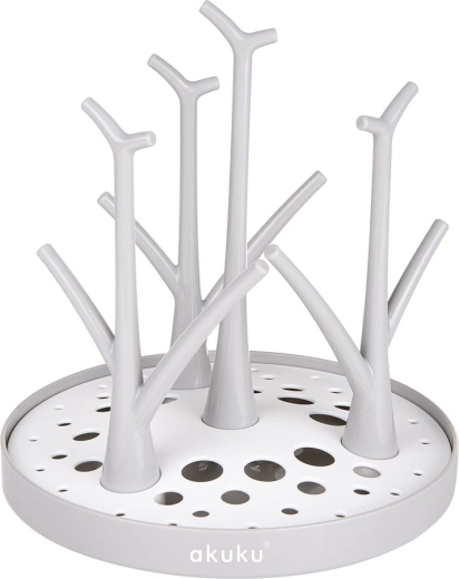 Drypstativet til flasker og tilbehør AKUKU er det ideelle valg for forældre, der vil have babyudstyret tørt og klar til brug. Det trælignende system af pinde holder flasker, sutter og låg i lodret position, så vandet hurtigt løber af, og luften kan cirkulere frit. De kompakte mål og den sammenklappelige konstruktion gør det nemt at transportere og opbevare, så det passer både i køkkenet og i rejsetasken.