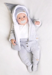 Den praktiske lynlås i fuld længde gør påklædningen nem uden at trække tøjet over hovedet. Sættet inkluderer en behagelig bomuldshue, som blidt omslutter hovedet og fuldender outfittet til koldt vejr.