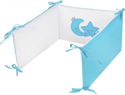 Matchende design i turkis og hvid med applikationer af måne og stjerner skaber en behagelig, beroligende atmosfære for lettere indsovning.