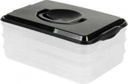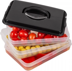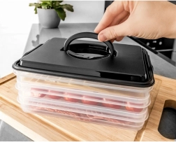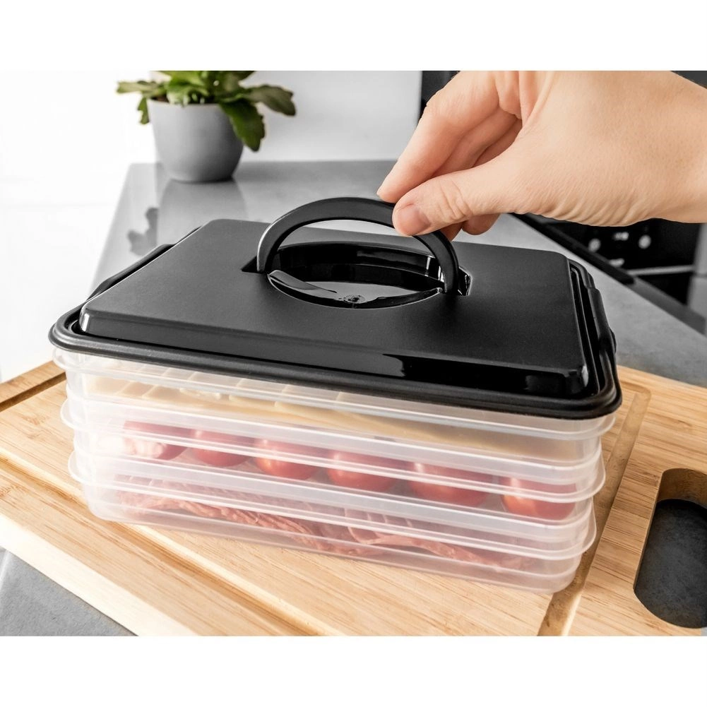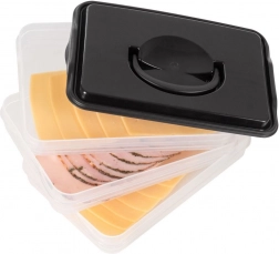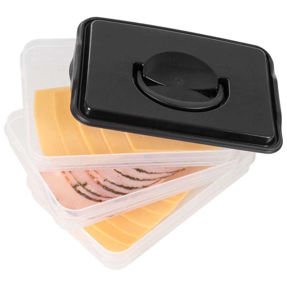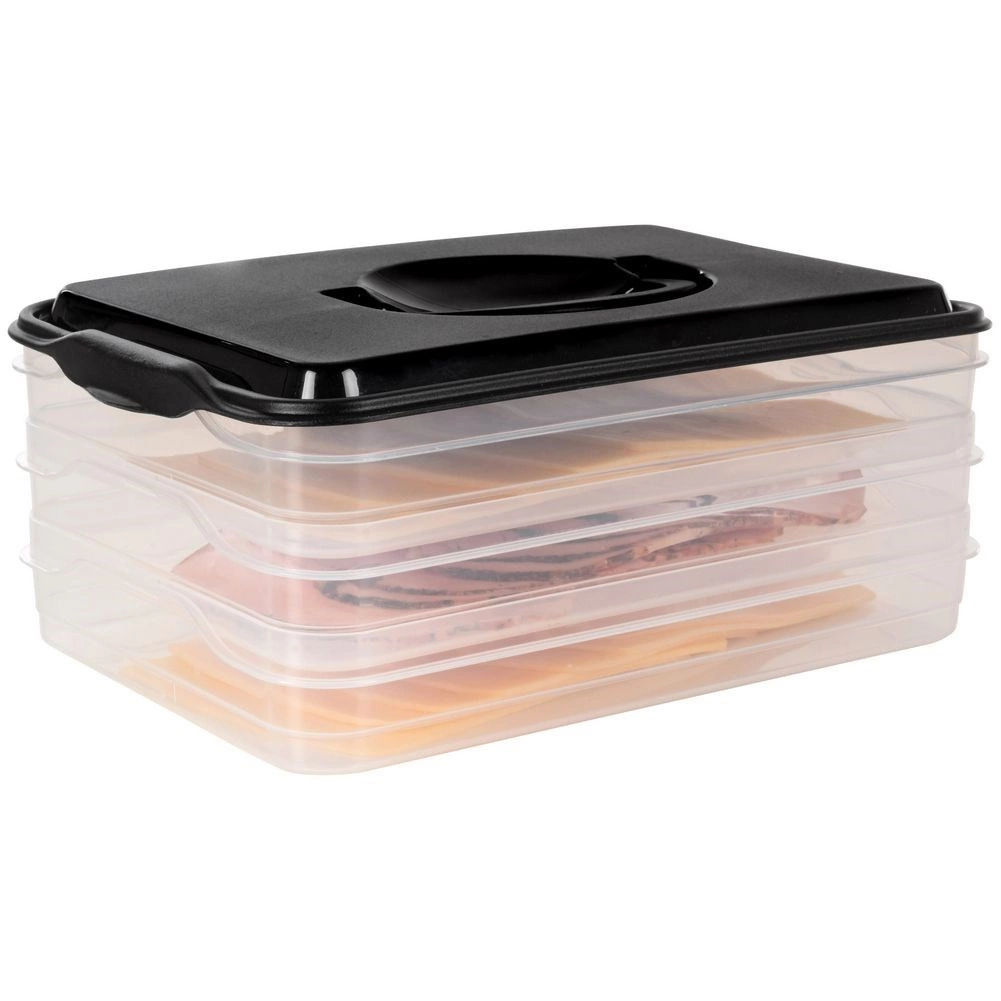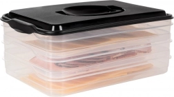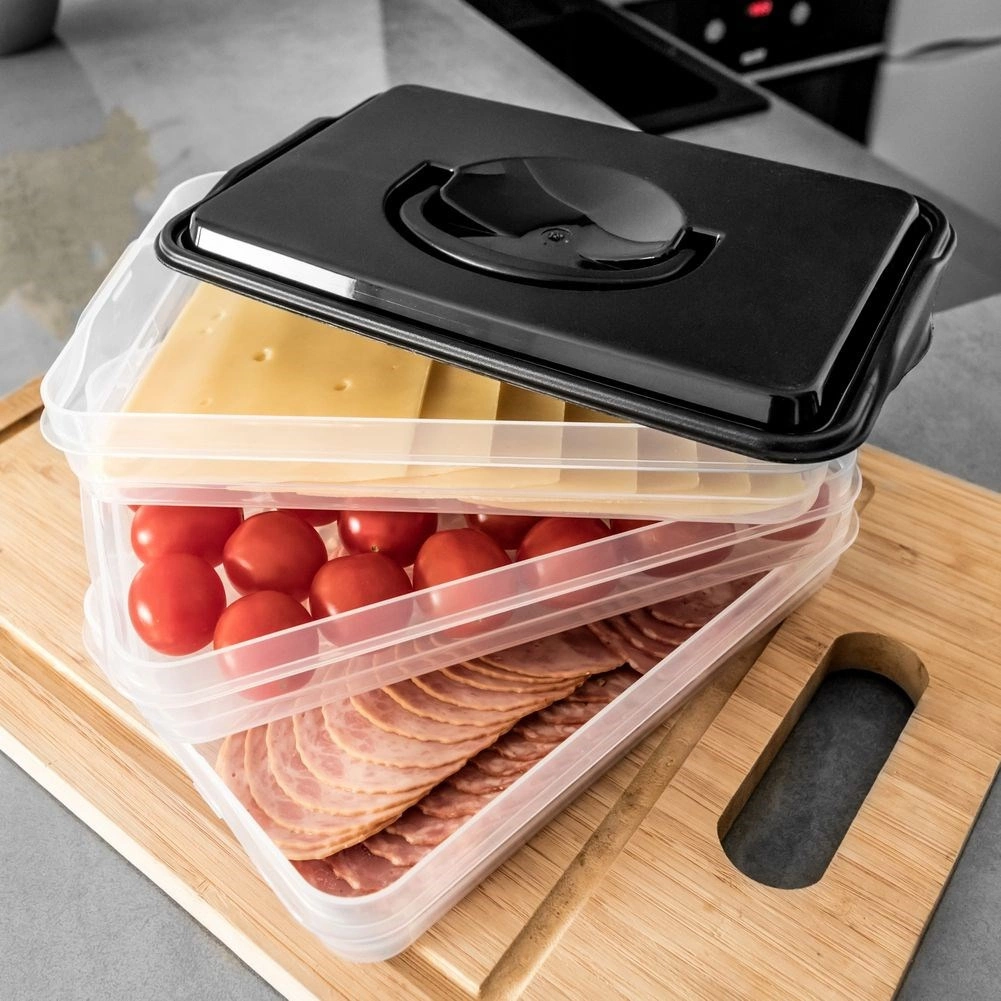 Denne smarte madorganizer tilbyder tre adskilte, gennemsigtige lag til praktisk opbevaring af skiveskårne oste, pålæg og små ingredienser uden lugtblanding. Den kompakte rektangulære form passer perfekt på køleskabshylderne, og det robuste sorte låg med håndtag gør håndteringen let.