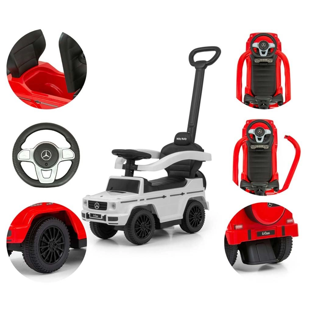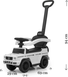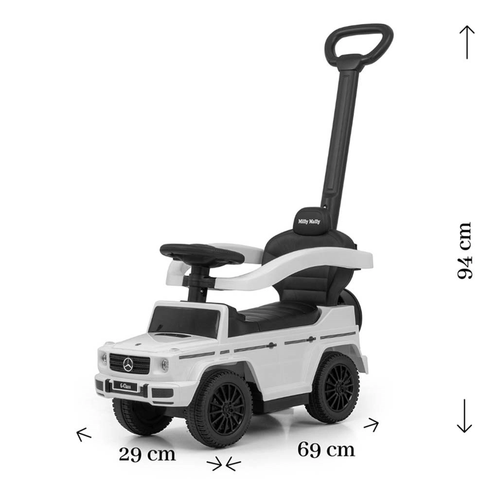 Stilfuld børneskubbecykel med licens fra MERCEDES inspireret af G‑Class, som giver sikker kørsel og masser af sjov for børn fra 12 til 36 måneder. Den tilbyder styrestang til forældre, drejelige forhjul, bredt sæde med opbevaringsrum og lydeffekter på rattet. Takket være de aftagelige sidearmlæn, fodstøtter og stang kan den nemt ændres fra en ledsaget vogn til en selvstændig skubbecykel.