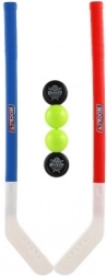 I pakken finder du en plastishockeystav, en puck og en bold for en komplet hockeyoplevelse.