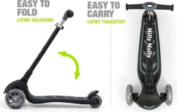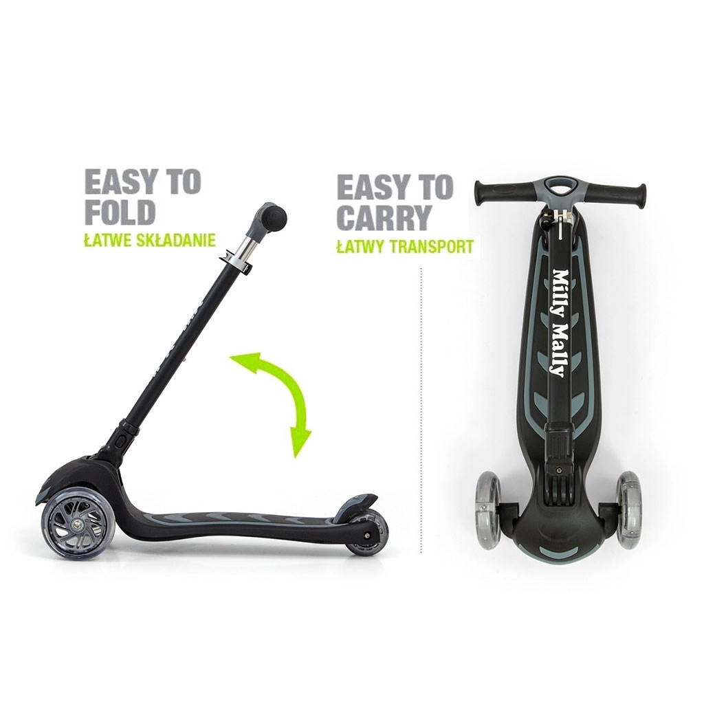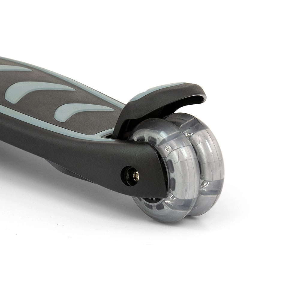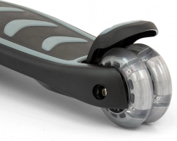 En stor fordel er tre hjul for maksimal stabilitet – foran lysende PU-hjul på 120 mm og nu et dobbelt lysende baghjul på 80 mm med skærmbremse. Bløde håndtag, skridsikker deck og lejer ABEC-7 sikrer en komfortabel, stille og sikker kørsel.