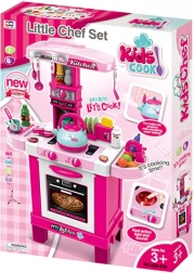 Det lyserøde legekøkken BABY MIX begejstrer små kokke med realistiske funktioner og masser af tilbehør. Det byder på lyseffekter, madlavningslyde, åbningsbar ovn, kaffemaskine, brødrister samt vask med armatur. Det er fremstillet af kvalitetsplast, står stabilt og giver med sine mål rigelig plads til leg. Strømforsyning med 3× AA-batterier (medfølger ikke). Velegnet til børn fra 3 år.