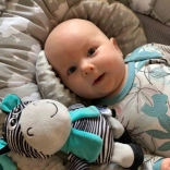 Den stribede zebra med forskellige teksturer og en blød bidering stimulerer berøring, syn og finmotorik hos babyen.