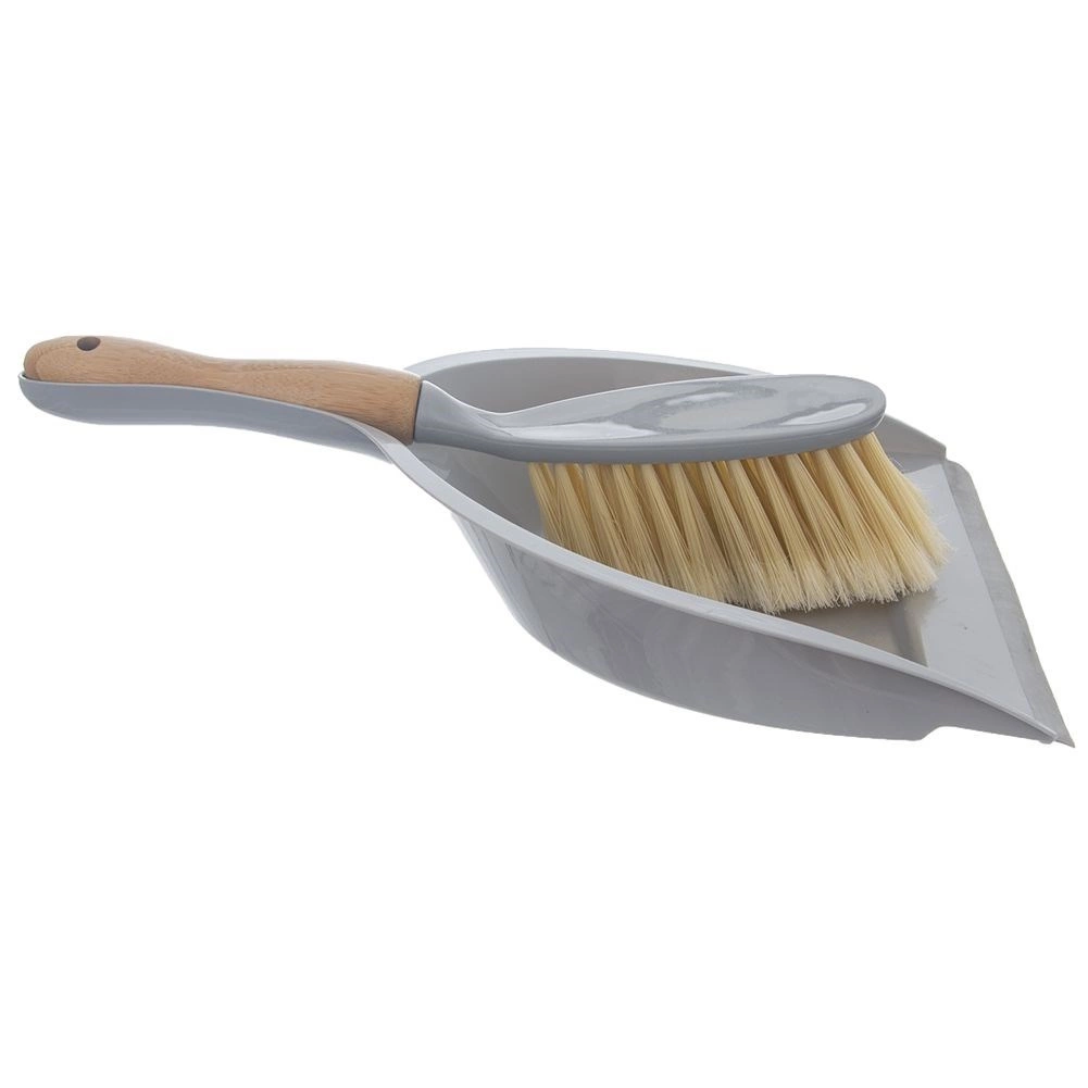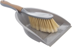 Praktisk rengøringssæt – fejebakke og kost i moderne grå med trædetaljer. Fejebakken har en gummikant for perfekt kontakt med gulvet, og kosten har et bambusskaft samt tætte børster, der effektivt samler op støv, krummer og pels. Ideel til enhver husstand, nem opbevaring takket være ophængningshuller.