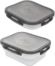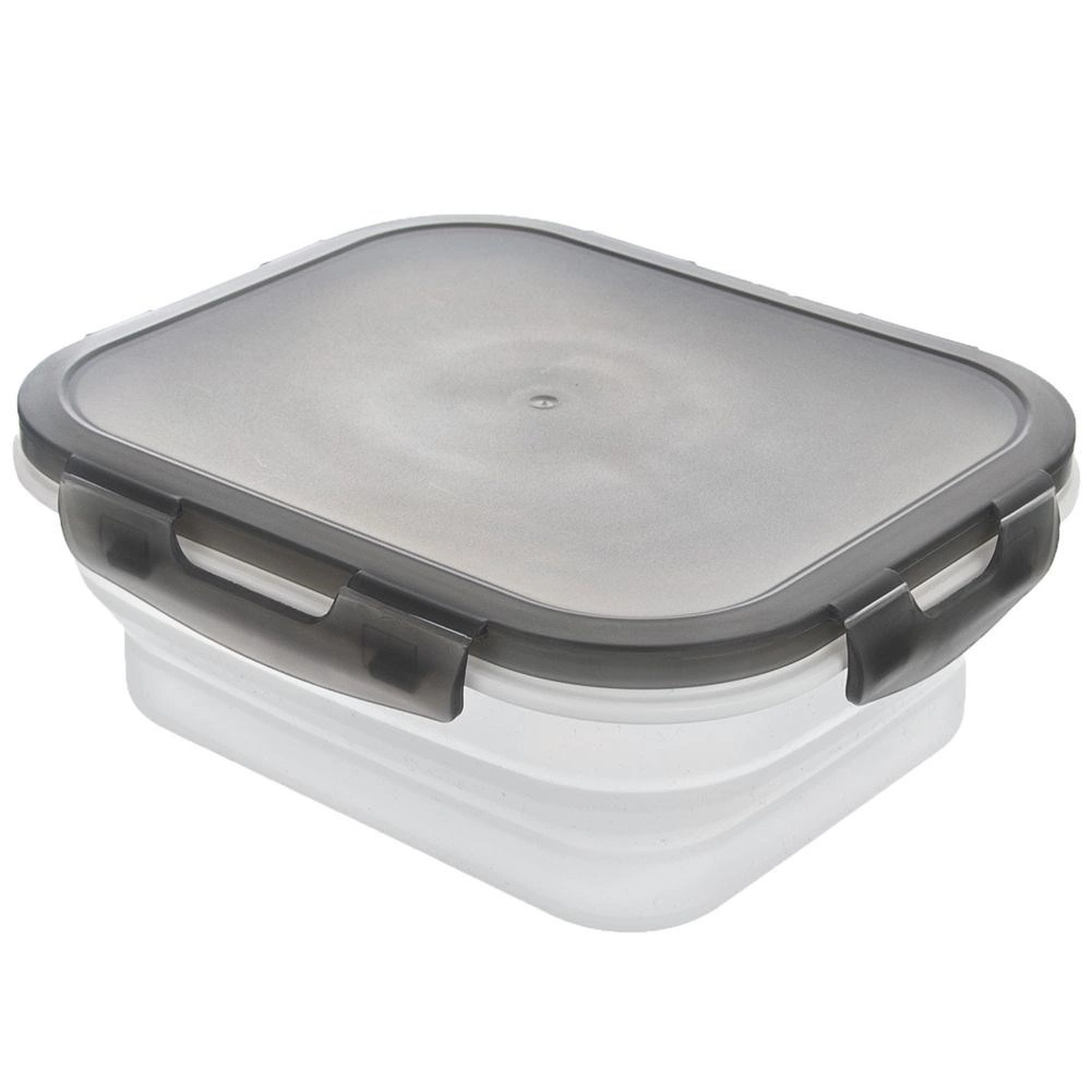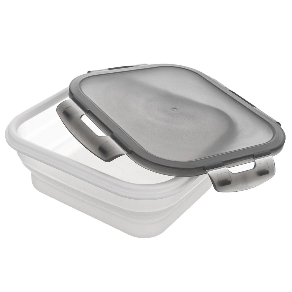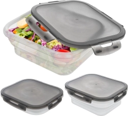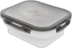 Praktisk sammenklappelig beholder på 1 l med silikonebund og et lufttæt låg med fire klips, som holder maden frisk og sikkert lukket. Takket være den sammenklappelige konstruktion sparer den plads, er ideel til rejser, camping og arbejde og kan komme i opvaskemaskinen samt bruges i mikrobølgeovnen (uden låg).