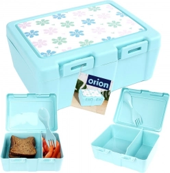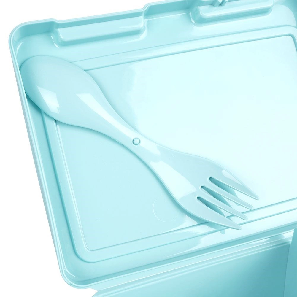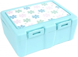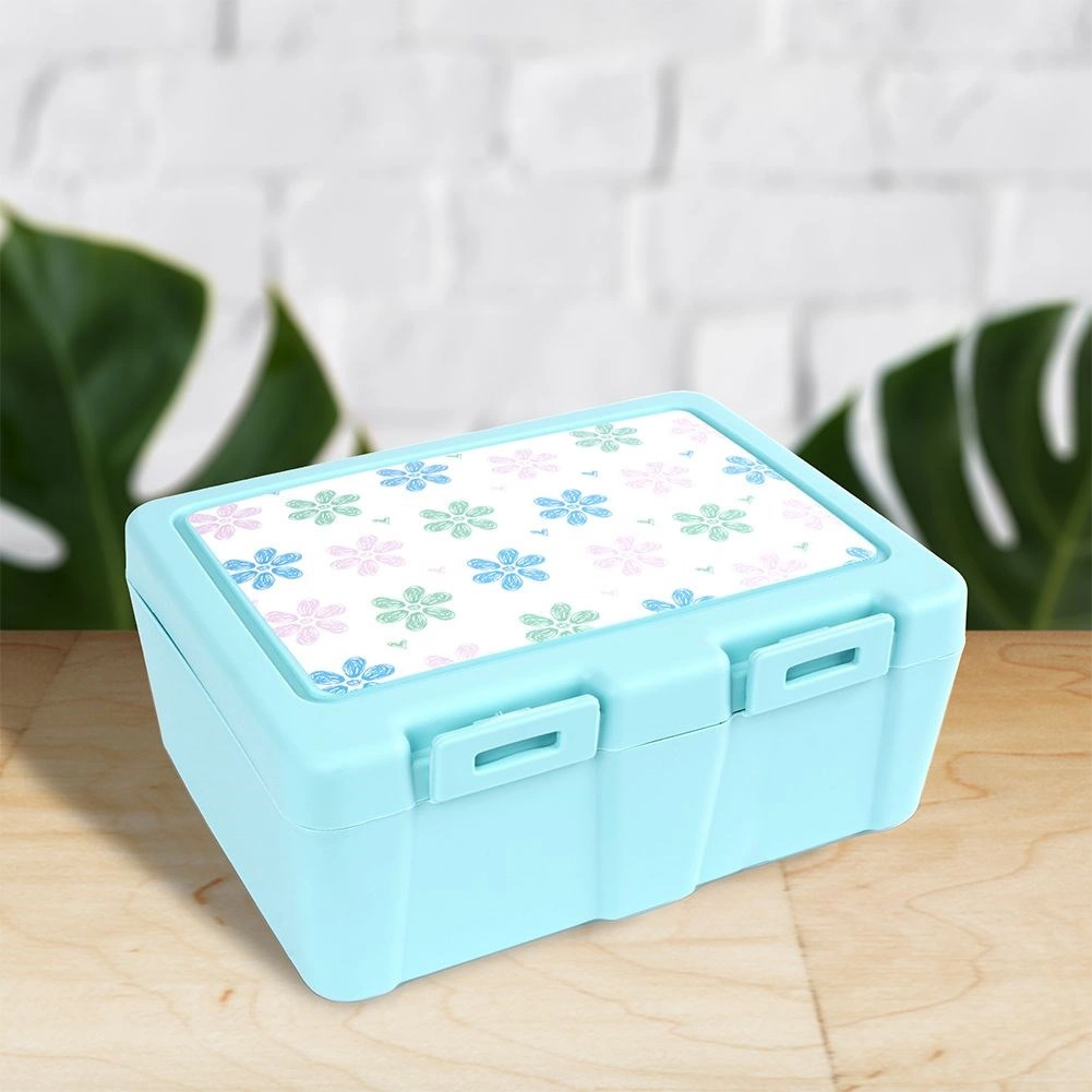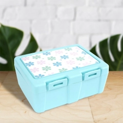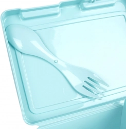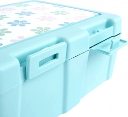 Stilfuld madkasse i blå tone med blomstermotiv på låget holder din mad pænt adskilt og sikkert lukket. Den indvendige skillevæg skaber to zoner til forskellige typer retter, mens den praktiske 2-i-1 spork (ske + gaffel) har sin plads under låget, så du altid har den ved hånden.