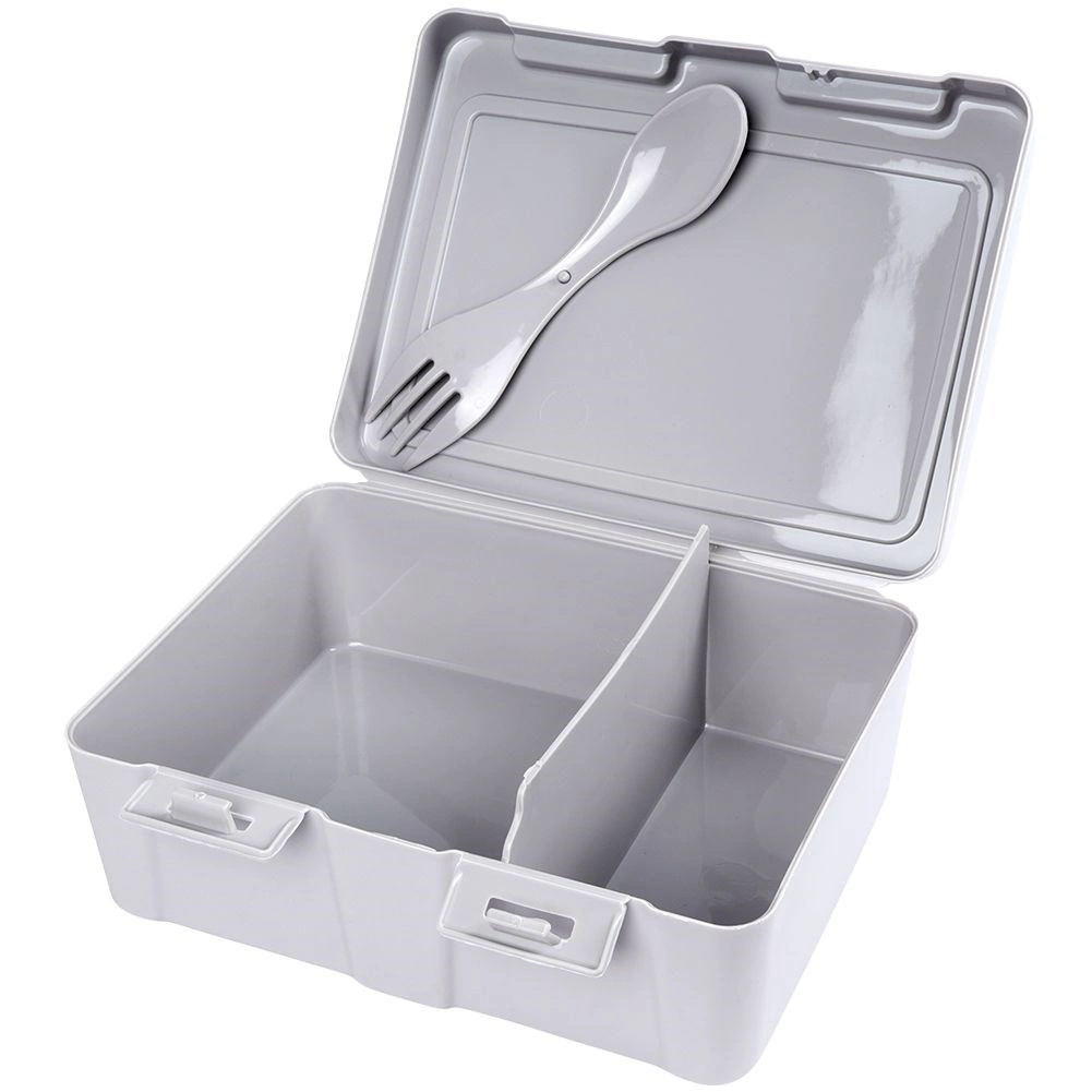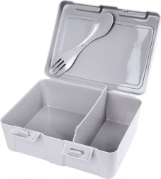 Madkassen med to rum holder din mad pænt adskilt og frisk. Den inkluderer smart 2-i-1 bestik (ske/gaffel) på 14,5 cm, som ligger under låget, så det altid er klar til brug. Det robuste design, de kompakte mål og de stærke klips giver sikker lukning under transport.