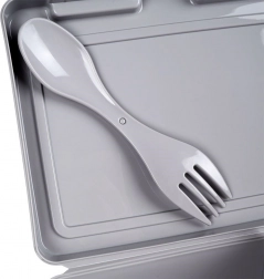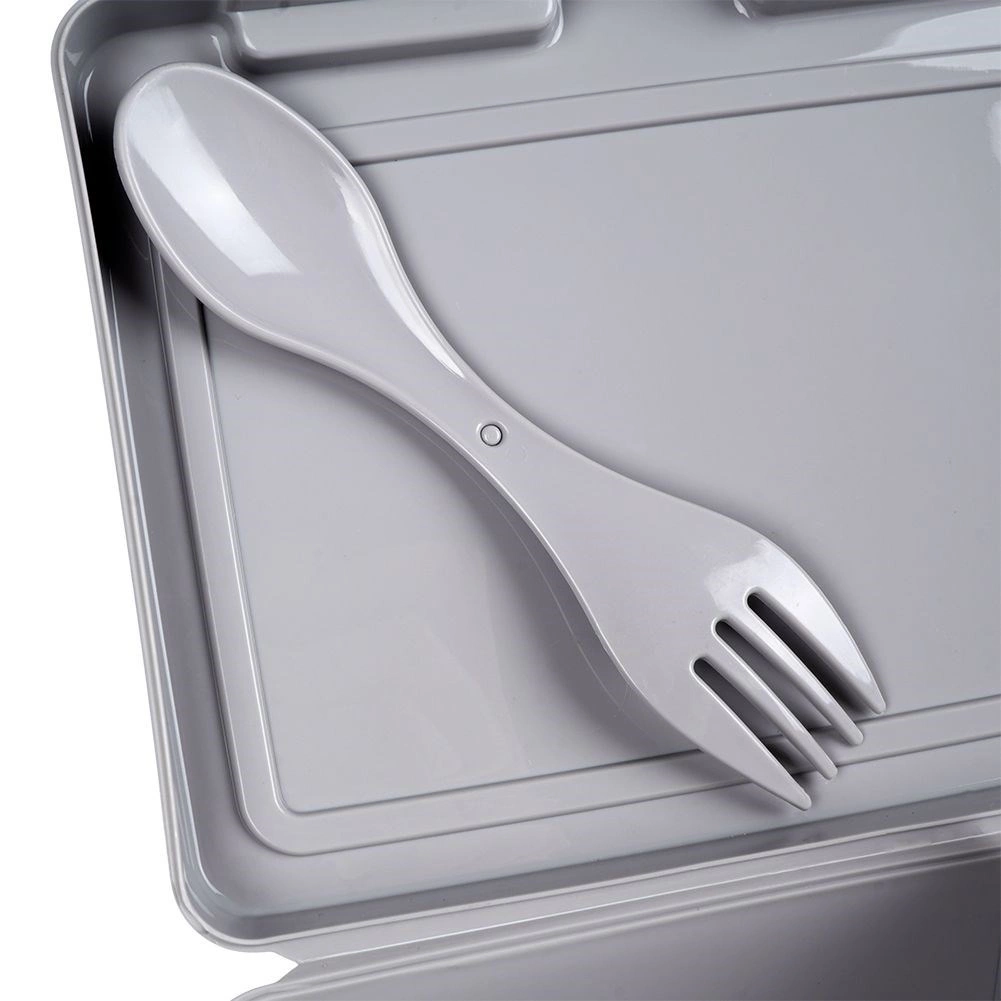 Kompakt ske-gaffel (14,5 cm) har sin plads under låget, så du ikke glemmer den og sparer plads i tasken.