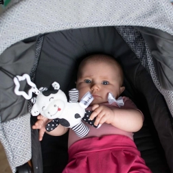 Legetøjet er fremstillet af kvalitetsmateriale, blødt og sikkert, behageligt at røre ved. Ideelt til at kramme, lege og til den første sensoriske stimulering. Den kompakte størrelse gør den let at lægge i klapvogn eller tremmeseng og den bliver hurtigt en yndlingsmakker på farten.