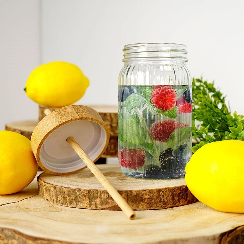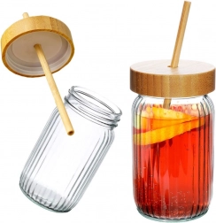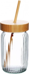 Denne elegante glas “mason” tumbler kombinerer funktionalitet og naturligt udtryk. Det ribbede klare glas ligger godt i hånden, bambuslåget med skrue lukker drikken tæt, og det genanvendelige bambussugerør giver behagelig nydelse. Perfekt til vand med frugt, hjemmelavet lemonade, smoothies og iskaffe – derhjemme, på terrassen og i haven.