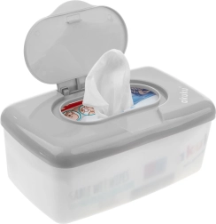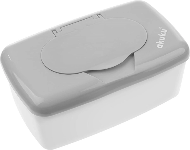 Praktisk boks til vådservietter fra AKUKU i grå farve holder servietterne friske og fugtige både derhjemme og på farten. Takket være de kompakte mål passer den nemt i tasken, den er let, og låget med en stor knap gør det muligt at åbne med én hånd.