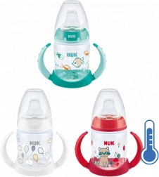 Praktisk NUK First Choice træningssutteflaske på 150 ml med temperaturindikator, som ændrer farve, hvis drikken er for varm. Takket være mjukt drypfri silikontud og ergonomiske, skridsikre håndtag gør den overgangen til selvstændig drikning lettere for barnet. Fremstillet af polypropylen uden BPA, nem at skille ad og rengøre.