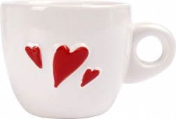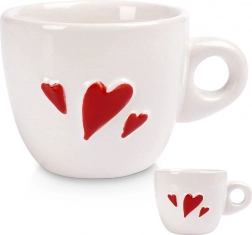 Nyd din yndlingsespresso i en kop, der glæder både øjne og hænder. Hvid keramik med plastiske røde hjerter giver din borddækning et romantisk strejf, mens den kompakte kapacitet på 80 ml fremhæver den fyldige crema og kaffens aroma.