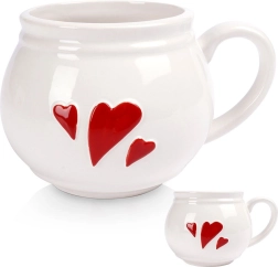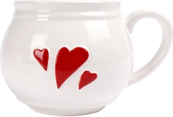 Stilfuldt hvidt keramisk krus med reliefprægede røde hjerter og ergonomisk hank er ideelt til hverdagens kaffe, te og kakao. Det tilbyder kapacitet 430 ml, holdbar udførelse, mulighed for opvask i opvaskemaskine og brug i mikrobølgeovn. Det er også perfekt til gløgg, og takket være det romantiske design er det en fremragende gave.
