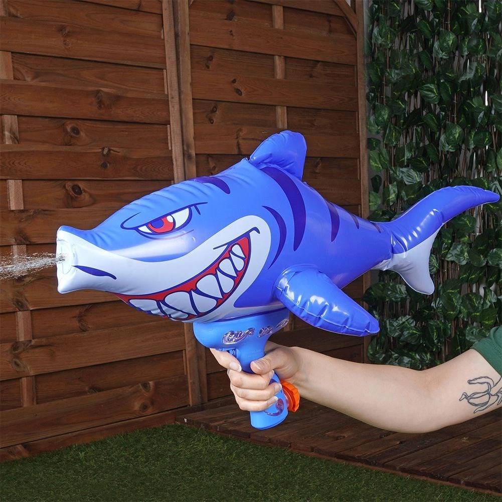 Den oppustelige vandpistol i hajform vil glæde børn på stranden, ved poolen og i haven. Med den medfølgende pumpe puster du den op på ingen tid, og efter legen lukker du let luften ud for nem opbevaring og transport. Det robuste design i plast af høj kvalitet sikrer mange timers bekymringsfri sjov.