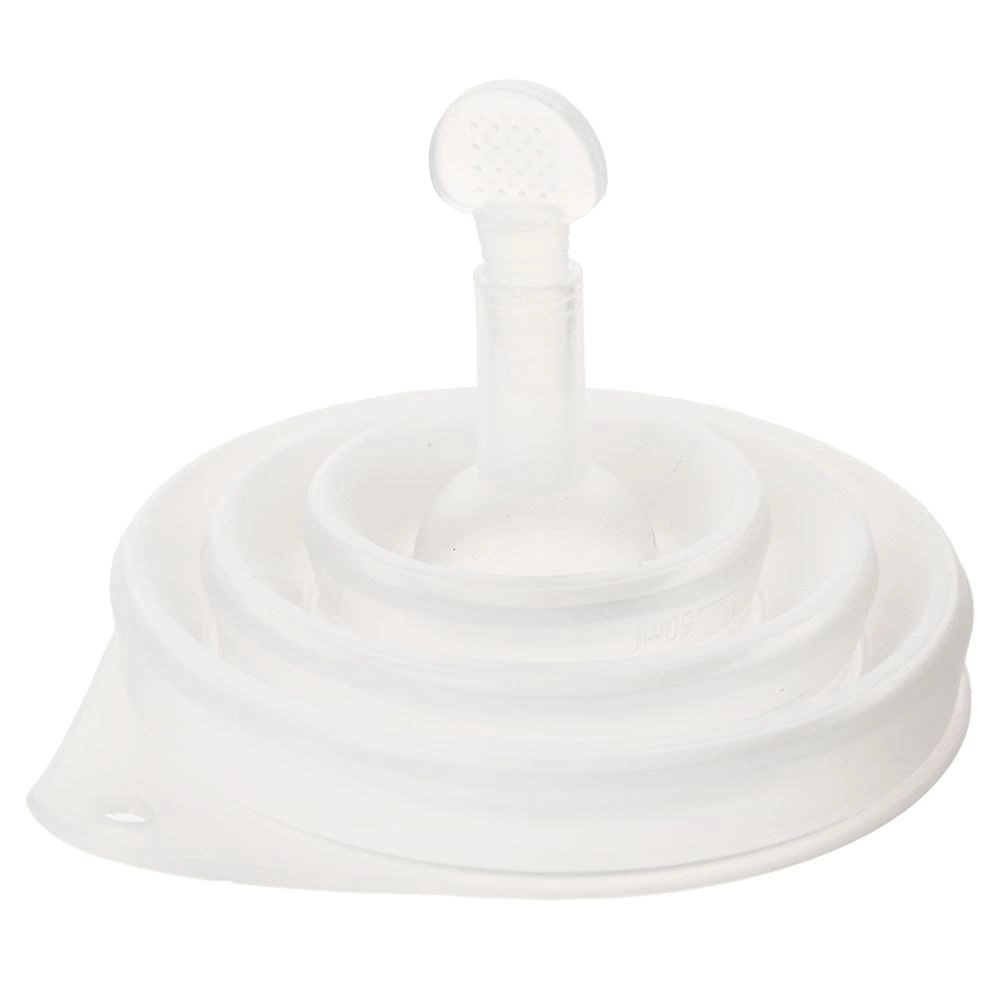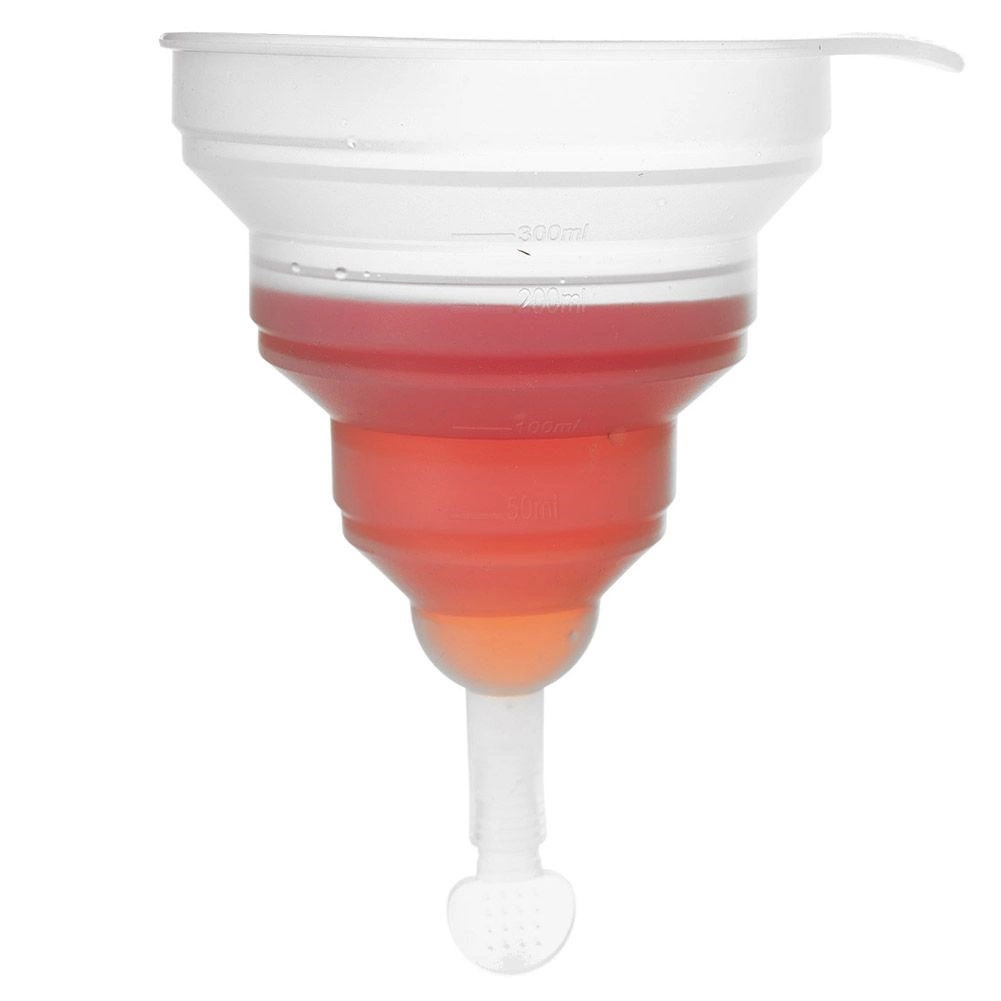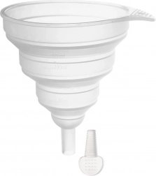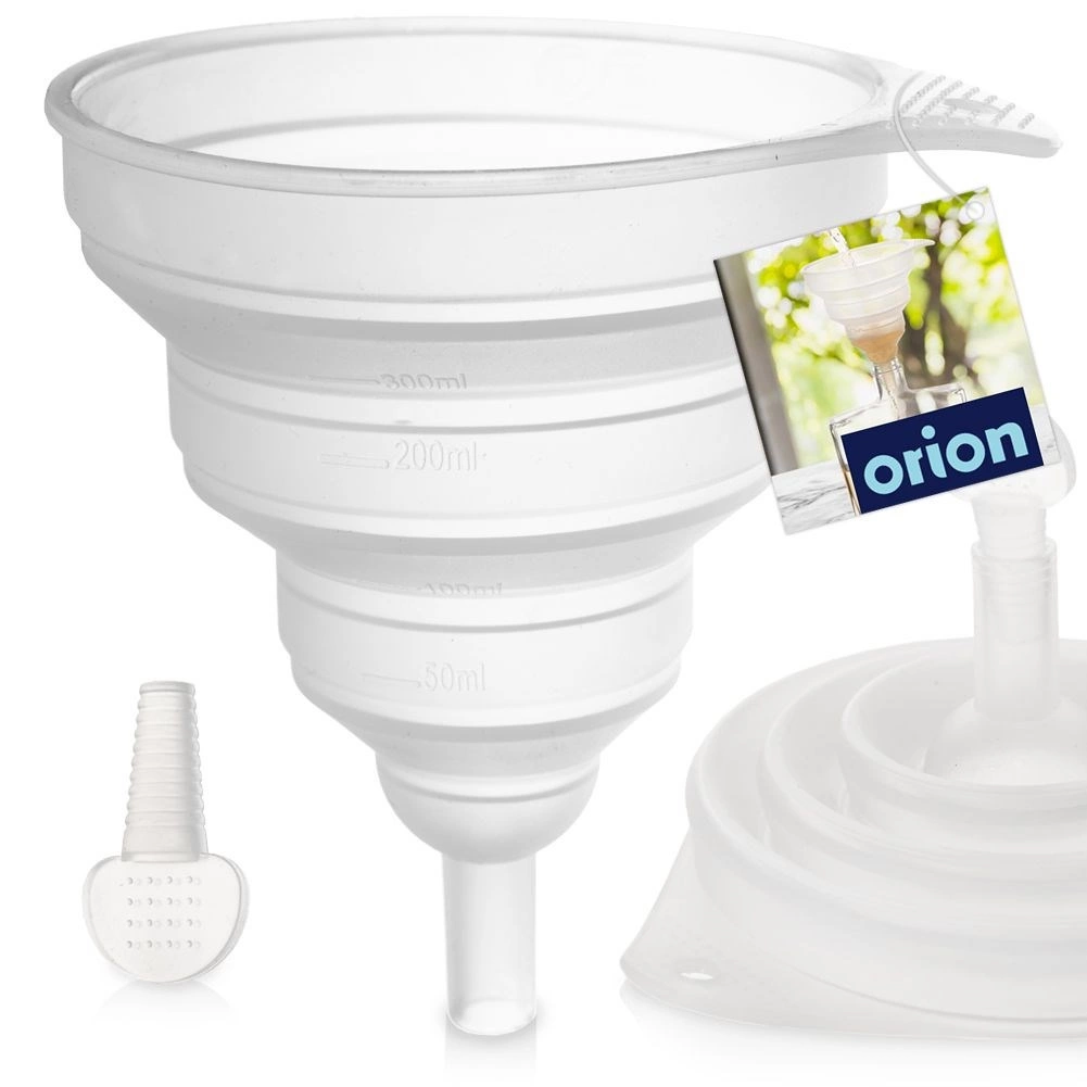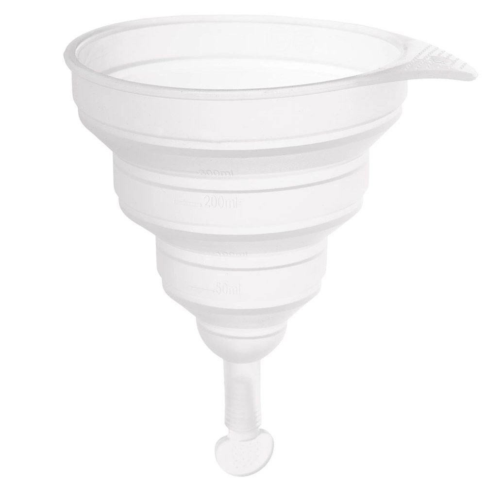 Den sammenklappelige tragt er en uundværlig hjælper i ethvert køkken. Takket være udførelsen i silikone er den let at opbevare, stabil og holder i mange år ved korrekt brug. Den integrerede måleskala 50–300 ml gør det nemt at måle både væsker og tørre ingredienser præcist.