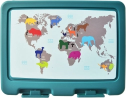 Praktisk madkasse med volumen 1 l, to rum og integreret 2i1-bestik (ske og gaffel) – ideel til canapéer, salater og snacks. Stærke klips sikrer tæt lukning, den indvendige opdeling forhindrer, at maden blander sig, og det kvalitetsmateriale i mat turkis med print af verdenskort med dyr glæder både børn og voksne.