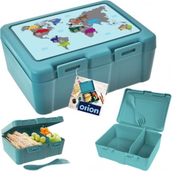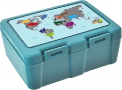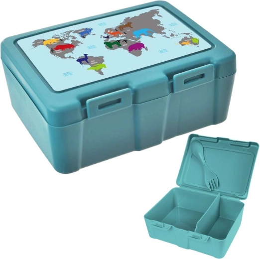 To praktiske rum gør det muligt at adskille hovedret og tilbehør eller frugt. Kraftige sideklips forhindrer utilsigtet åbning og spild af indholdet, så du kan stole på en ren rygsæk eller taske. Det attraktive turkise design med verdenskort og dyr motiverer til sundere snacks og glæder både små og store.