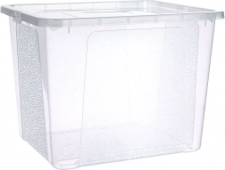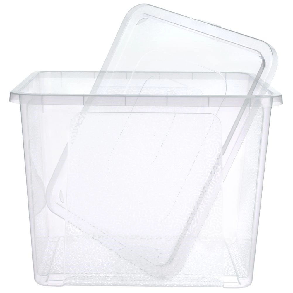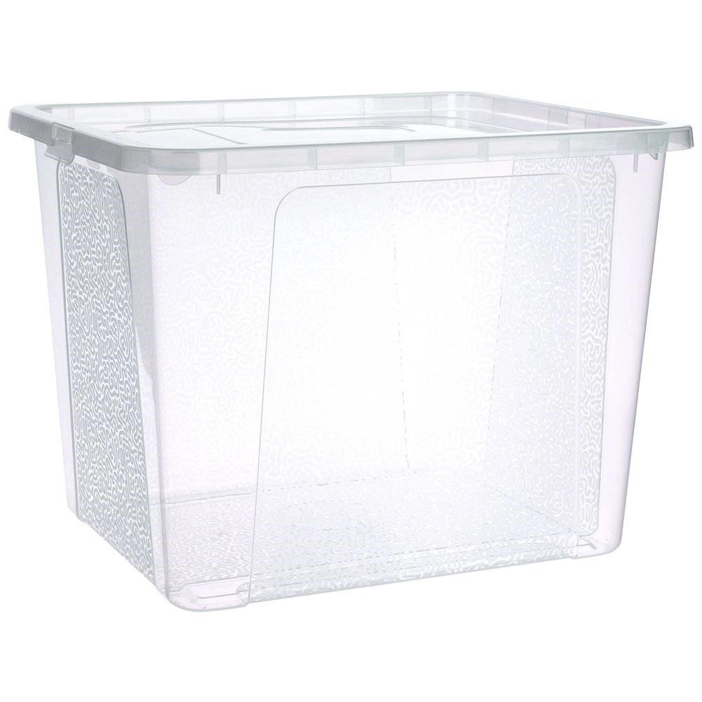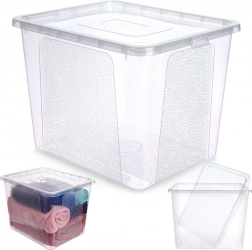 Den multifunktionelle opbevaringsboks med låg er uundværlig til organisering og pladsbesparelse på hylder, i skabe og reoler. Det gennemsigtige design muliggør hurtig identifikation af indholdet, mens den lette og samtidig stærke konstruktion sikrer lang holdbarhed og nem håndtering. Den diskrete dekoration på siderne giver boksen et stilrent udseende.
