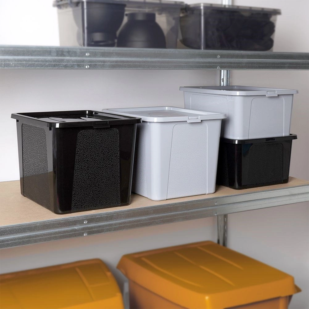 Brug den til overskuelig opbevaring af sengetøj, legetøj, tøj, tekstiler, køkkenudstyr, værktøj, bøger eller dokumenter. Det elegante sorte design med en diskret relief passer perfekt ind i både moderne interiører og tekniske rum.