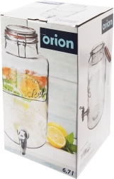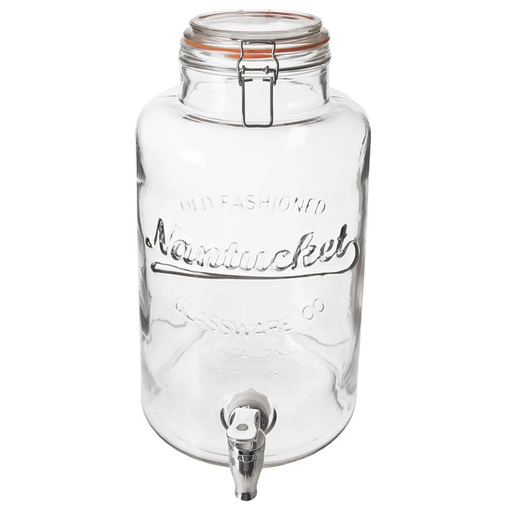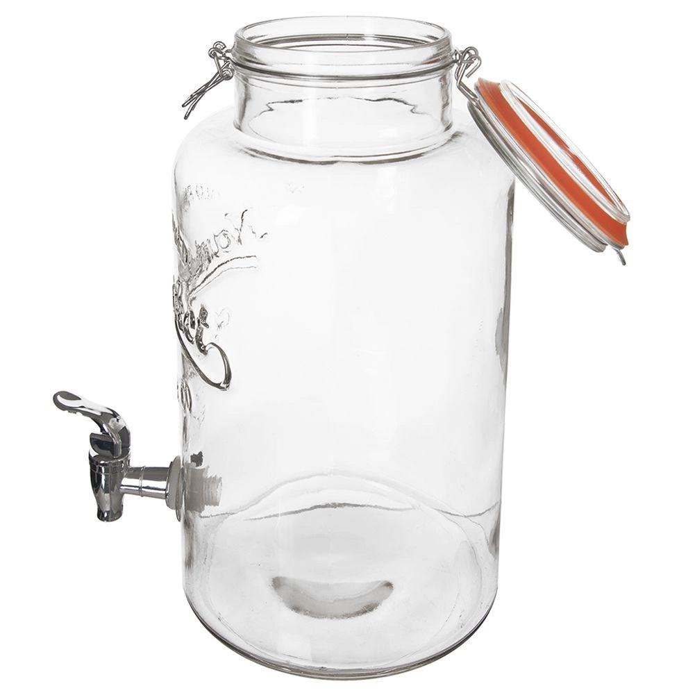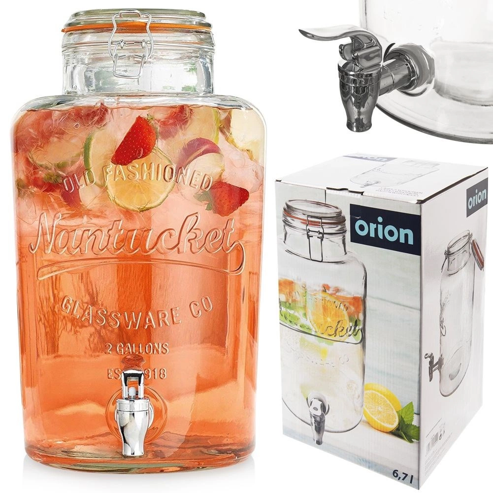 Stilfuld glasdispenser til drikkevarer med en kapacitet på 6,7 l, metalhane og lufttæt kliplåg – ideel til hjemmelavet lemonade, vand med frugt og iste. Den store åbning gør det nemt at fylde og rengøre, det slidstærke, tykvægget glas med relief præsenterer indholdet flot, og låget med silikonepakning beskytter drikkevarerne mod insekter.