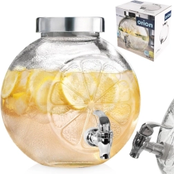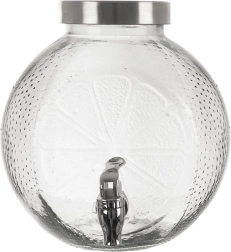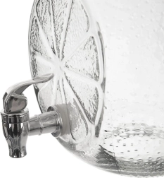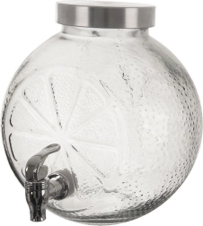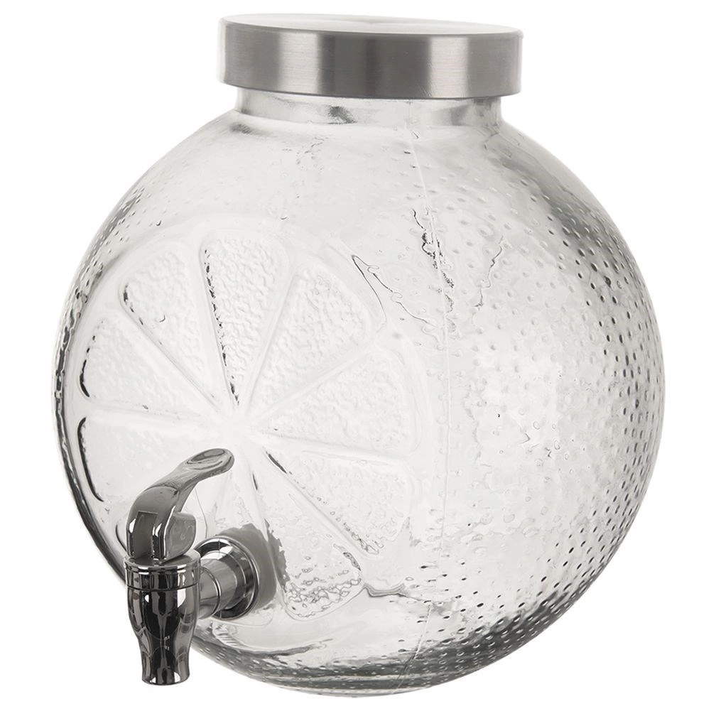 Den rummelige glasdispenser med hane serverer elegant vand med frugt, citronade og forfriskende punch. Det tykke kvalitetsglas med relief af citrusskiver er fødevaresikkert og giver både et attraktivt udseende og høj styrke. Det skruede metaldåg beskytter indholdet mod snavs og insekter, mens metalhanen gør det nemt at tappe uden at spilde.