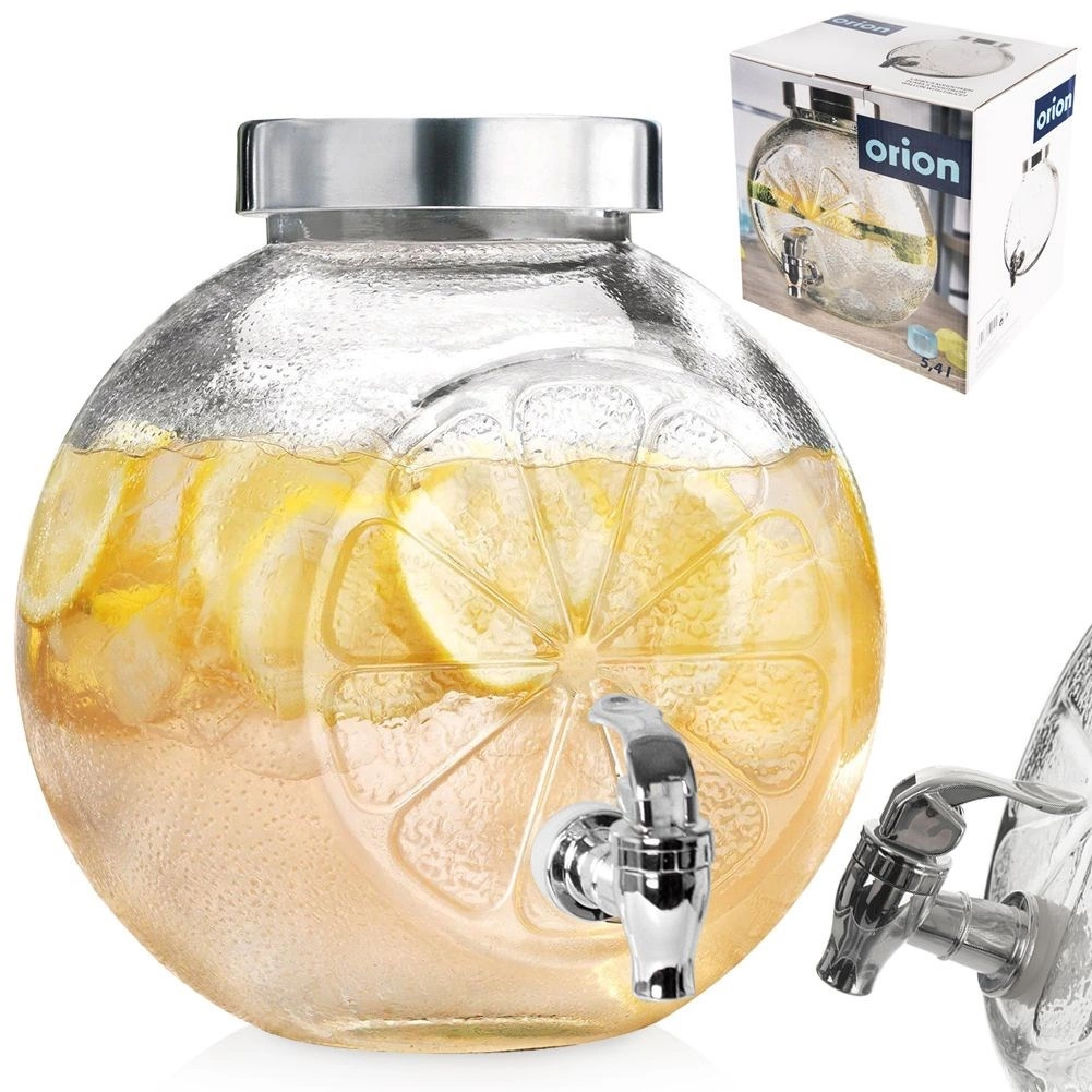 Stilfuld glaskom dispenser på 5,4 l med metallåg og praktisk hane – ideel til limonade, juicer og hjemmelavet iste. Robust klart glas med dekorativt citrusmønster, bred åbning for nem påfyldning, og låg som beskytter mod insekter gør den perfekt til havefester og servering derhjemme.