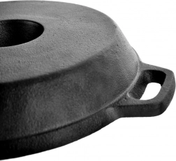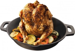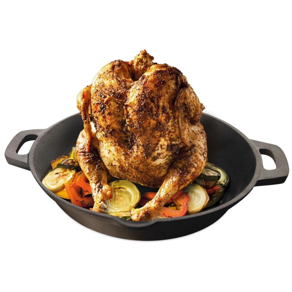 Denne massive støbejernspande med integreret stativ er skabt til perfekt stegt kylling – også i “øl under kyllingen”-stil. Midterpinden kan fyldes med øl eller vin for ekstra saftighed og aroma, mens der er god plads omkring til kartofler eller grøntsager. Støbejern sikrer jævn varmefordeling og holder på varmen længe, så maden forbliver varm længere.