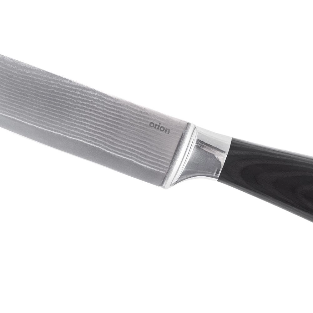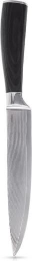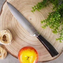 Universel køkkenkniv med en samlet længde på 30,5 cm og en klinge på 17 cm – ideel til daglig skæring, hakning af grøntsager, frugt og krydderurter. Fremstillet af 67-lags damaskusstål for enestående skarphed og holdbarhed, med et ergonomisk håndtag i pakkatræ, som tåler fugt, varme og kemikalier. Fremragende balance og behageligt greb sikrer præcist og sikkert arbejde i køkkenet.