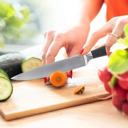 Udmærker sig ved alsidighed til skæring af kød, grøntsager og frugt, hakning af krydderurter samt forberedelse af råvarer til supper og salater. Med korrekt pleje bevarer kniven sin skarphed i lang tid. For maksimal levetid anbefales håndvask og grundig aftørring.