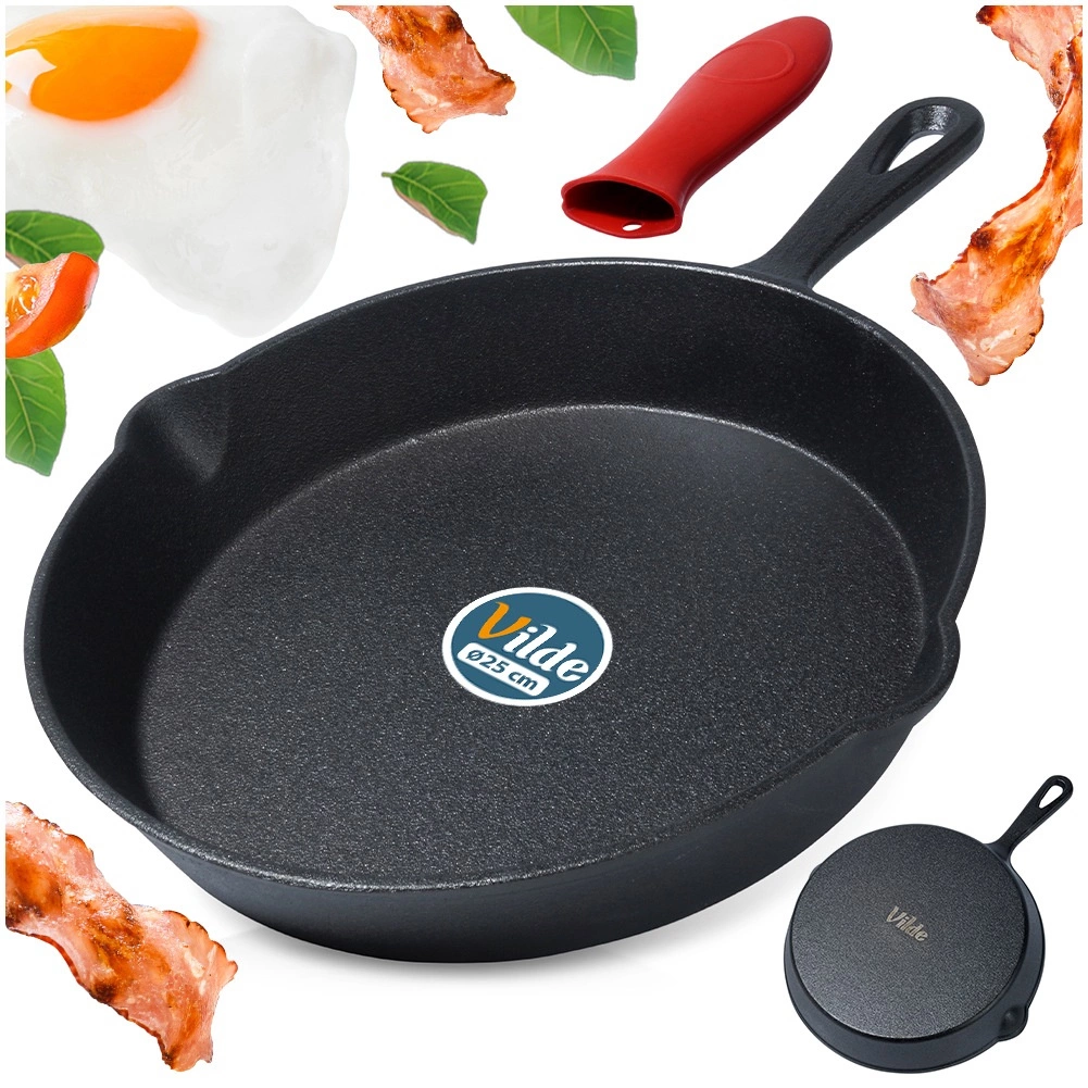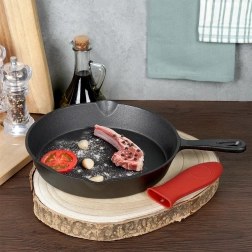 Robust støbejernspande med en diameter på 25 cm med fremragende varmeakkumulering til hurtig og jævn stegning, braisering og bagning. To praktiske hældetud gør det nemt at hælde, og det røde silikoneovertræk på håndtaget sikrer et sikkert greb. Velegnet til gas, el, keramik, halogen og induktion samt i ovn og på grill.