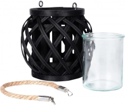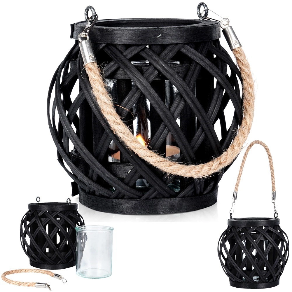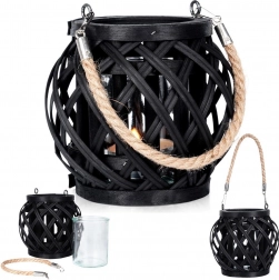 Denne dekorative lanterne af naturligt bambustræ, lakeret sort, er ideel til hyggelige aftener på altanen, terrassen eller i stuen. Den åbne fletkonstruktion skaber effektfulde lysreflekser og giver rummet en behagelig, beroligende atmosfære.