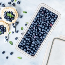Den lave profil og det flade låg sparer plads i køleskabet og muliggør sikker stabling af flere beholdere.