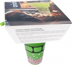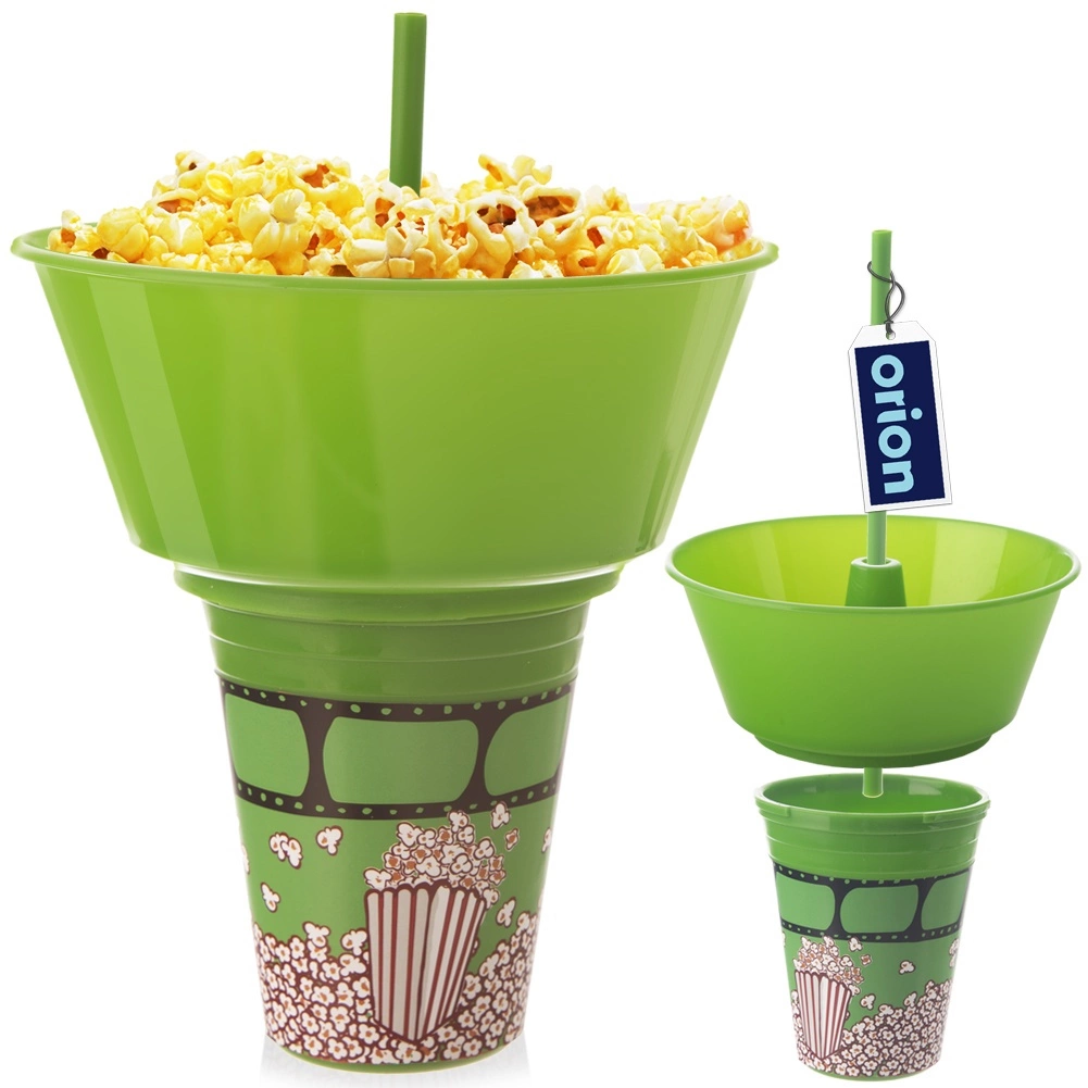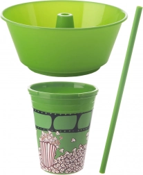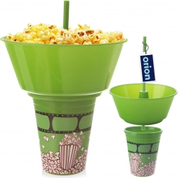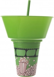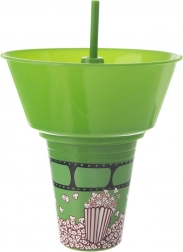 Den praktiske 2-i-1-løsning kombinerer en nederste kop til drikkevarer og en aftagelig øverste skål til popcorn eller andre snacks. Det integrerede sugerør i midten lader dig drikke uden at afbryde underholdningen, mens skålen rummer rigeligt med godter til behagelig snacking. Det grønne design med popcornmotiv ser godt ud både derhjemme og på vej i biografen.